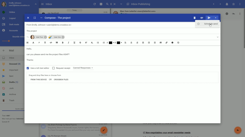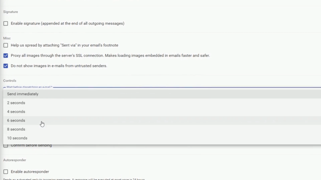 Opzione per ritardare l’invio delle email, consentendo di annullare l’invio in caso di ripensamenti.