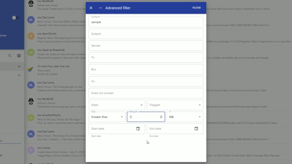 Trova rapidamente email o allegati specifici utilizzando criteri dettagliati come mittente, oggetto, destinatari, stato, dimensione e intervallo di date.